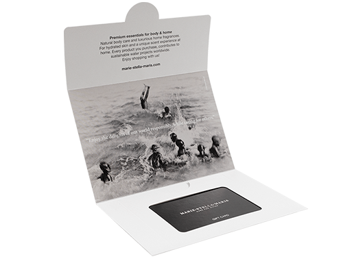 Deze fysieke giftcard wordt geleverd in een stijlvol mapje. De fysieke giftcard is te besteden in al onze Marie-Stella-Maris winkels & refill stores en op marie-stella-maris.com.